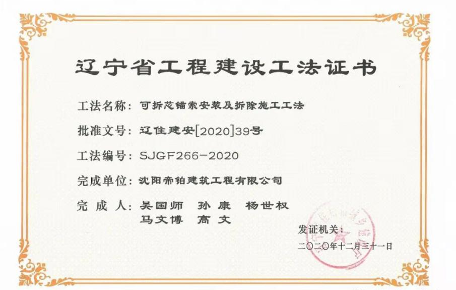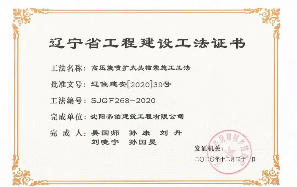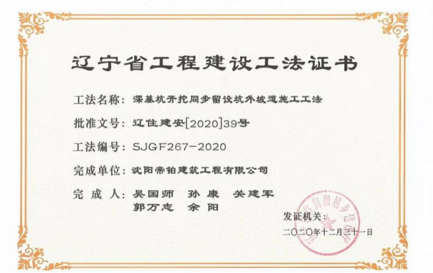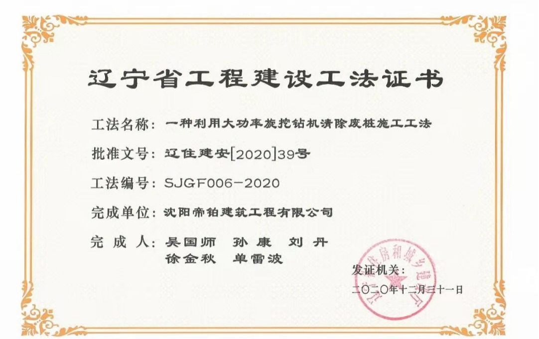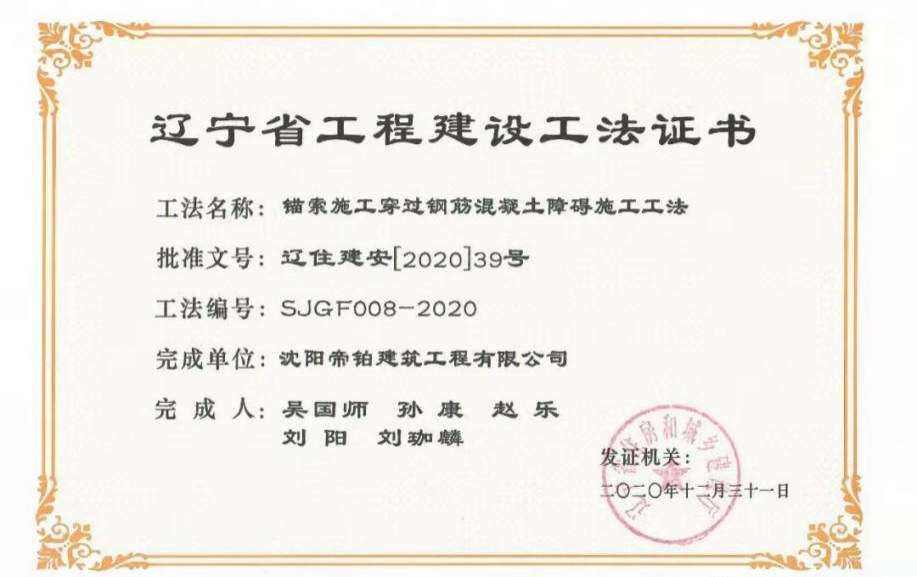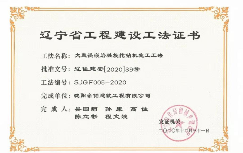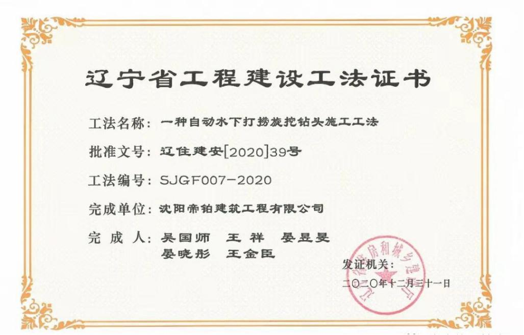 經(jīng)公司技術(shù)團(tuán)隊(duì)的不懈努力,2020年度我公司有10項(xiàng)工法被遼寧省住房和城鄉(xiāng)建設(shè)廳評(píng)定為遼寧省工程建設(shè)工法,分別為快速安放可回收鋼套管施工工法、大直徑嵌巖樁旋挖鉆機(jī)施工工法、一種利用大功率旋挖鉆機(jī)清除費(fèi)樁施工工法、一種自動(dòng)水下打撈旋挖鉆頭施工工法、錨索施工穿過(guò)鋼筋混凝土障礙施工工法、鉆孔灌注樁防斷樁施工工法、可拆芯錨索安裝及拆除施工工法、深基坑開(kāi)挖同步留設(shè)坑外坡道施工工法、高壓旋噴擴(kuò)大頭錨索施工工法、深基坑越冬防凍脹施工工法。