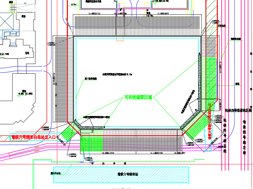 設(shè)計(jì)情況:基坑深度暫定約為15.5m,基坑安全等級(jí)為一級(jí);基坑?xùn)|側(cè)臨地鐵四號(hào)線,且支護(hù)樁與地鐵四號(hào)線間有規(guī)劃地鐵六號(hào)線出入口,基坑南臨規(guī)劃六號(hào)線車站,西南角有規(guī)劃地鐵六號(hào)線出入口?;诱w采用混凝土支護(hù)樁+錨索支護(hù)體系,支護(hù)樁直徑600mm、樁間距1.2m,東側(cè)和西南角采用可回收錨索。