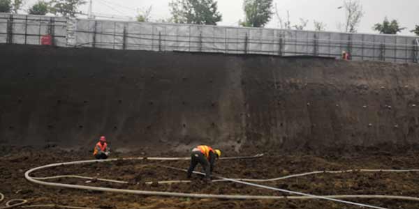 本次基坑支護施工是二期部分高層及地下停車場。采用樁錨+放坡素噴混凝土的支護體系,鋼管樁樁長9.0m,樁間距0.5m,兩排錨索,錨索間距為1.2m。