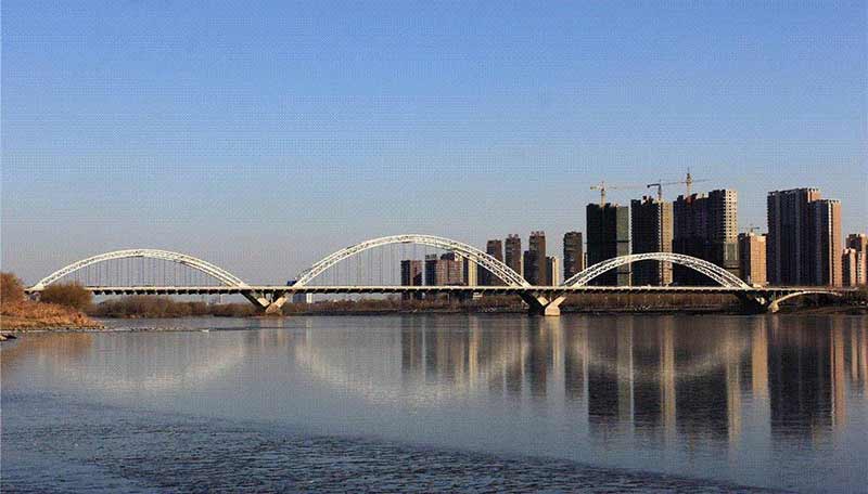 渾河長青大橋位于沈陽市東南部,橋梁由主橋和南北引橋組成,主橋為三孔中承式鋼管混凝土拱橋,凈跨徑127.226m+147.992m+127.226m,南北引橋各為 60.95+52.502m 的空腹式鋼筋混凝土拱肋橋,橋梁全長 629.348m。該項目的維修改造工程主要包括兩側(cè)新建橋梁和舊橋的加固維修。在舊橋左右兩側(cè)新建同跨度橋梁各一幅,橋梁每幅橋?qū)捑鶠?4.5m,跨徑布置為51.85+52.502+127.226+147.992+127.226+52.502+51.85=611.448m。