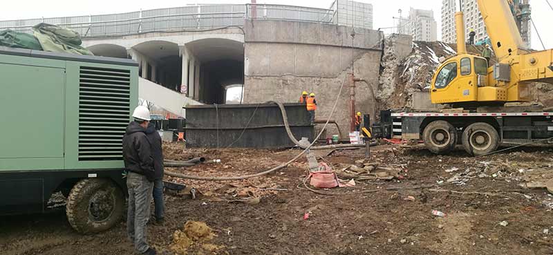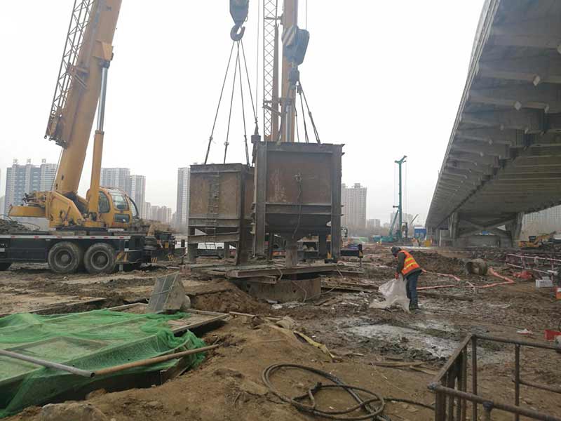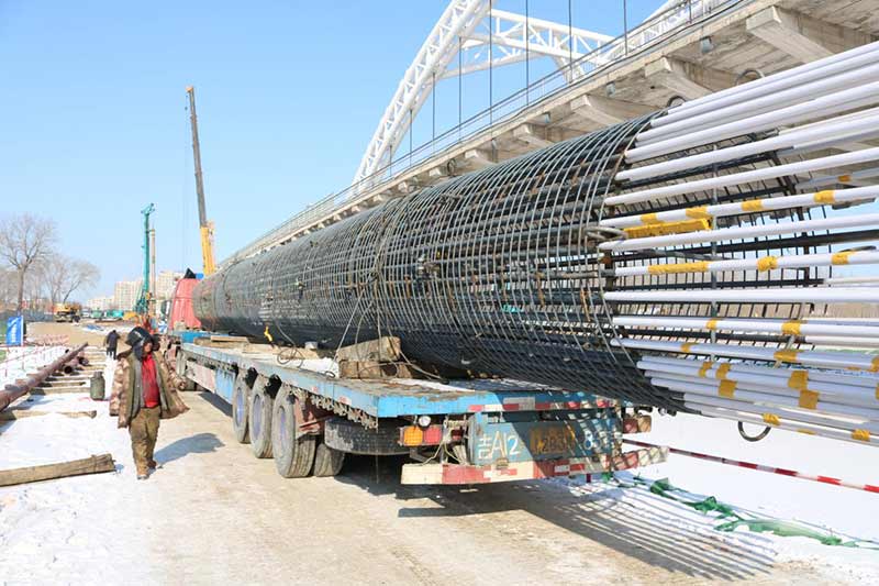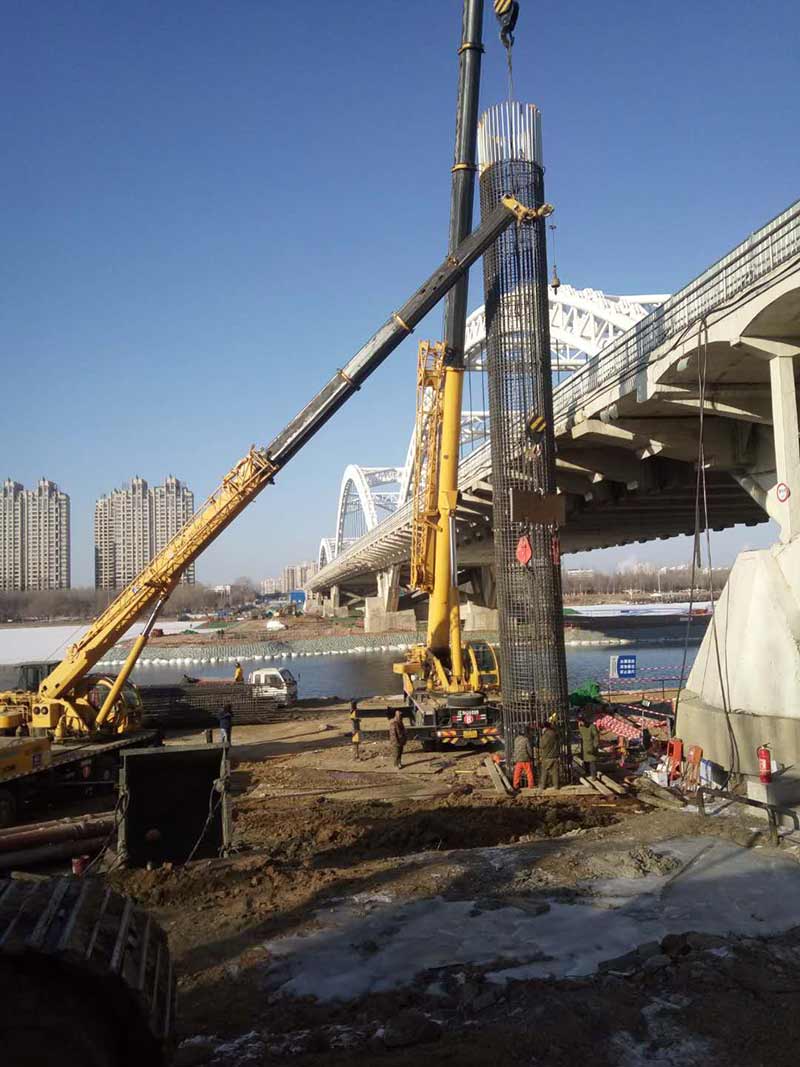 長青橋新建橋梁位于長青橋兩側(cè),西側(cè)樁型為摩擦樁,東側(cè)樁型為端承樁;樁基礎(chǔ)采取大直徑混凝土水下灌注樁,西側(cè)樁徑為Ф2m,東側(cè)樁徑為Ф1.5m、Ф2m、Ф2.5m、Ф2.8m,共計55根,Ф2.5m樁最深鉆孔深度達73.8m,進入中風化5m,Ф2.8m樁最深鉆孔深度達71.5m,進入中風化5.6m;其中,72#、73#、74#、75承臺在渾河中,71#、76#、77#在河岸上;東側(cè)新建橋梁距地鐵較近,為保證施工安全,在距離地鐵10號線較近處的樁采取安放鋼護筒至泥礫2.5m的保護措施,Ф2.5m,Ф2.8m樁最深鋼護筒埋設(shè)至44m,其中77臺Ф1.5m樁首次采用全回轉(zhuǎn)鉆機埋設(shè)護筒,護筒最深埋設(shè)至52m。二次清孔方式采用氣舉反循環(huán)清孔。Ф2.5m、Ф2.8m樁采用雙導管灌注,首灌使用2個5.7m³大料斗封底,