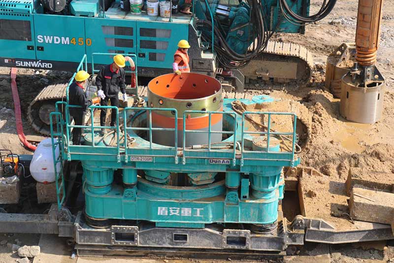 新建東側(cè)橋梁75、76承臺樁基礎(chǔ)施工前采用旋噴加固處理,旋噴樁最大深度為48米,已超過旋噴鉆機成孔極限,采用百米鉆機引孔,安放PVC塑料管,引孔完成后進行旋噴。旋噴完成后旋挖采用擴孔鉆頭擴孔安放長鋼護筒。
